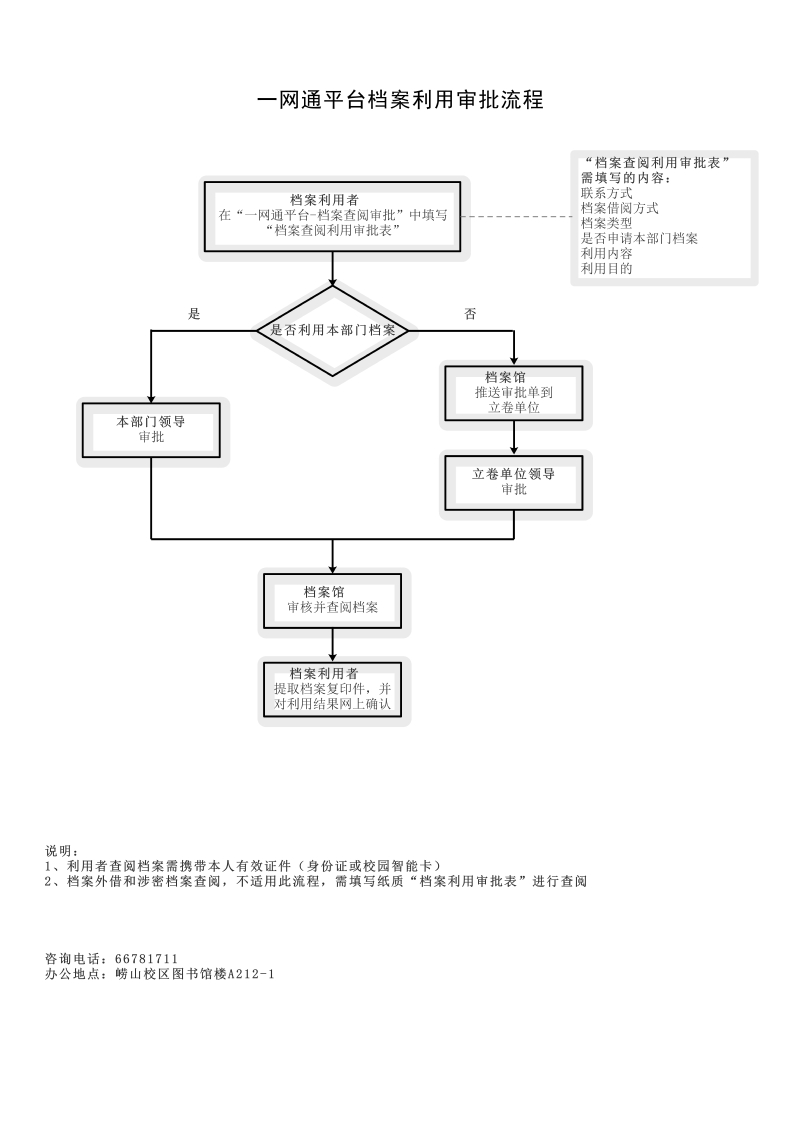 特别说明 | 1.馆藏档案原件原则上不借出。 2.利用教职工人事档案,请联系学校人事处人事服务中心档案室(电话:66781890)。 3.利用户籍档案,请联系学校保卫处政保科(电话:66781821、82032250)。 4.利用涉密档案,须经学校保密部门(电话:66782727)在《档案利用审批表》上审批。 5.档案外借和涉密档案查阅,不适用一网通平台申请查阅,需填写纸质《档案利用审批表》进行查阅。 |