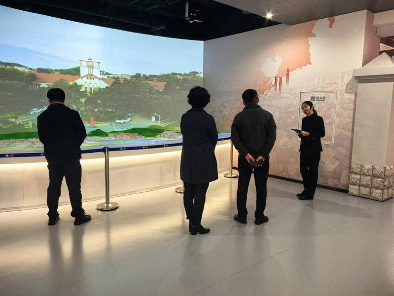 11月12日,崂山区教体局副局长薛晓鸣、刘传魁等参观校史馆,讲解员王誉博。