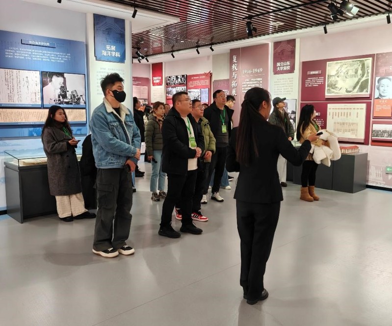 12月10日,参加“青春华章 向海图强”大思政课网络主题宣传和互动引导活动的各界媒体参观校史馆,讲解员陈晓菲。
