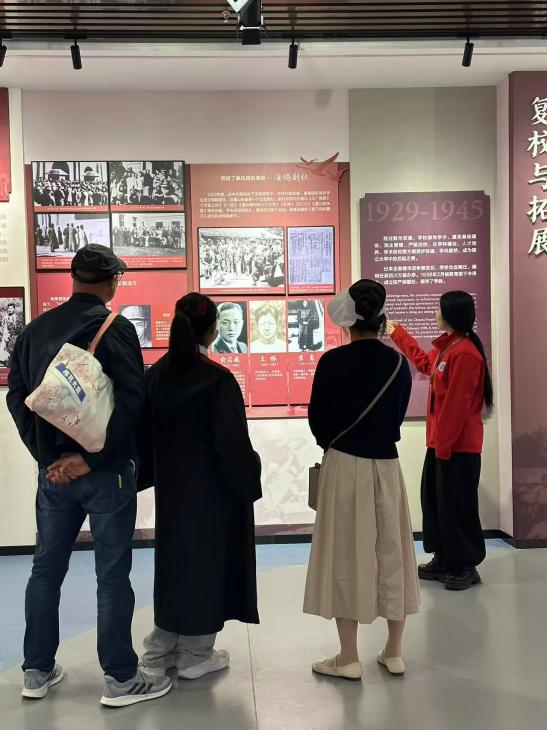 4月8日,康复大学机关教工、我校土木工程行业分会校友参观校史馆,讲解员邵滢棋。