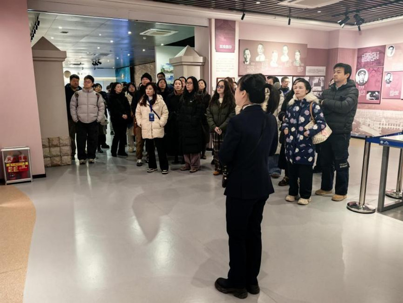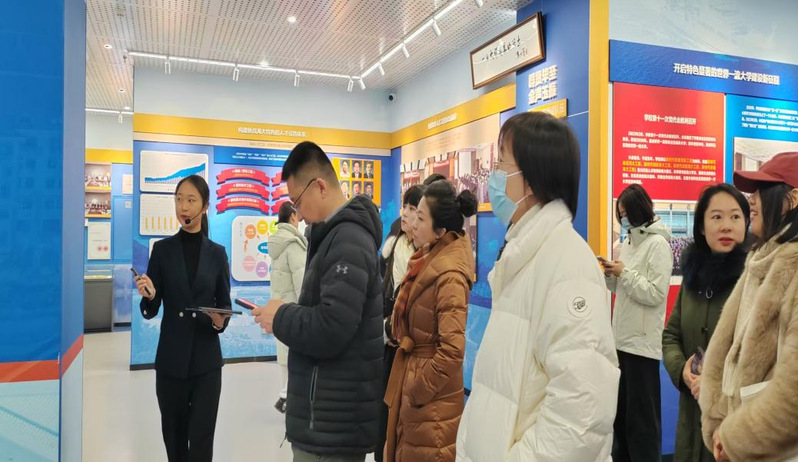 1月31日,“中外合作办学规范办学专题培训班”培训人员参观校史馆,讲解员陈晓菲、孟蔷。