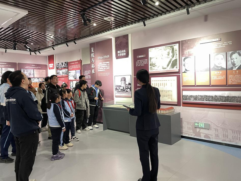 3月19日,海洋与大气学院2024级本科生、中国海洋大学附属学校初中部学生参观校史馆,讲解员陈晓菲。