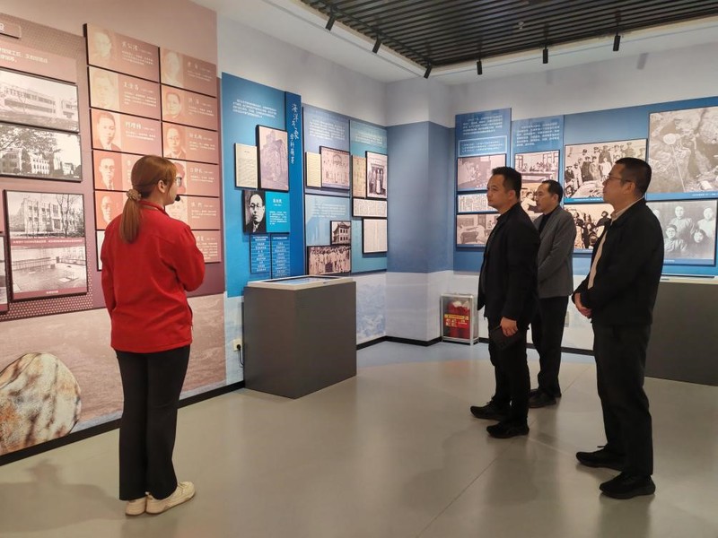3月27日,广东省中山市人社局局长黄学礼一行参观校史馆,讲解员包丰瑜。